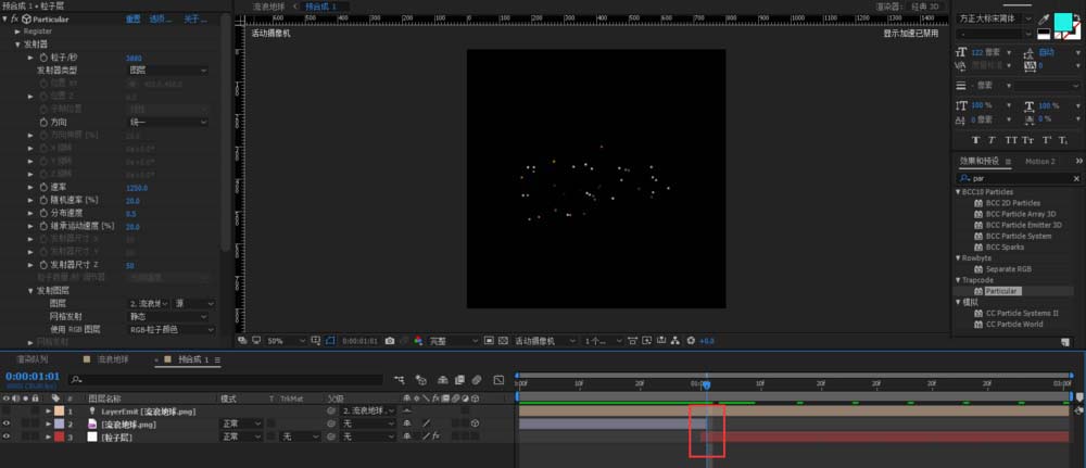 3、ctrl+y新建一个纯色层命名为粒子层,并添加Particular粒子插件效果;调整相应的参数,将发射器的类型选择为图层,将发射图层选择为素材图片(前提得打开素材图片的3D开关);