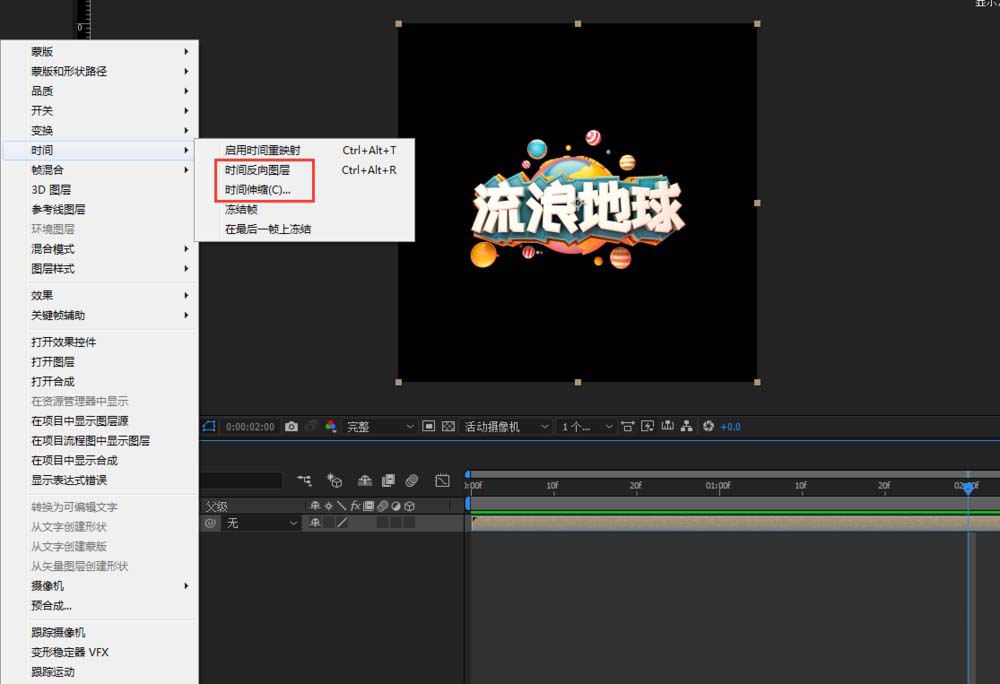 5、ctrl+shift+c选中所有图层,新建预合成,然后右击选择时间-时间反向层,将做好的效果,倒放;然后再选时间-时间伸缩来调整时间节奏快慢;