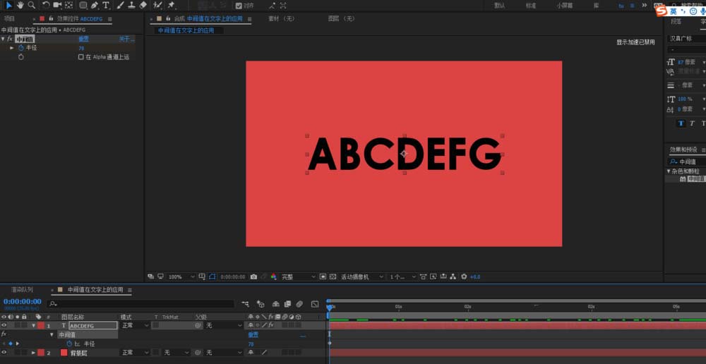 4、选中文本图层添加中间值,我们先通过给半径k关键帧来实现不同的文字效果,开始78,结束为0,实现一个文字慢慢被填充的效果;反之倒过来的一个慢慢消失的效果;开始为0结束为78;