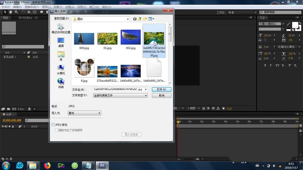 1、最首要的步骤就是图片素材的素材库导入,导进去之后再导入合成里面的时间线上