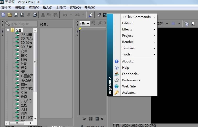 1、首先要在vegas上安装一个Vegasaur插件,安装完毕后是这样: