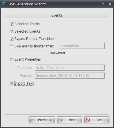 7、在对话框选第二个“Create text at events”,下面选择之前保存的字幕预置,点Next。