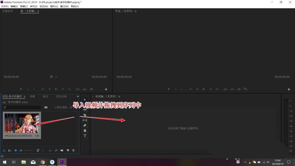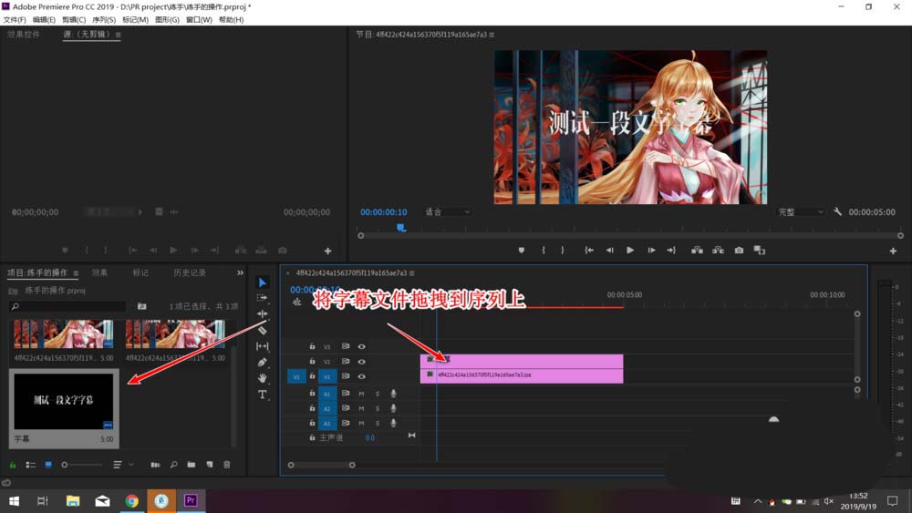 7、接下来我们直接关闭该界面即可。这个时候我们可以看到序列上并没有显示字幕,而在项目的管理器中有字幕文件,我们将其拖拽到序列上即可。