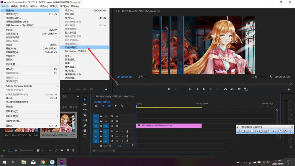 3、导入将素材拖拽到轨道上,新建一个序列,然后我们点击新建-旧版标题,可以增加一个字幕。