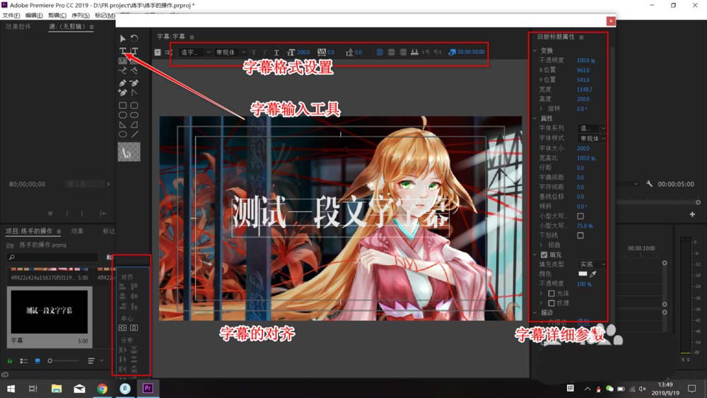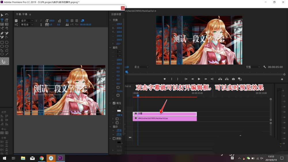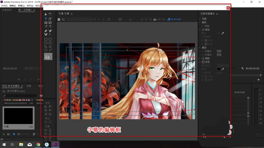 5、接下来,会弹出字幕的编辑框,编辑框中,我们可以预览序列轨道中正在播放的画面,因此我们可以根据画面输入和移动文字的位置。
