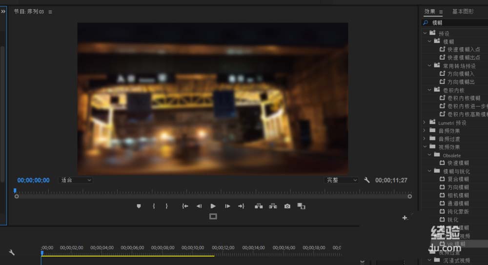 4、在效果窗口中搜索模糊效果,会出现很多跟模糊有关的效果,这里注意要选择视频效果中的VR模糊效果。