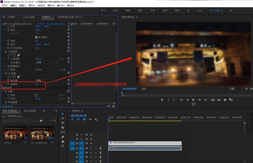 5、选择了视频效果中的VR模糊效果之后,将VR模糊效果拖动到时间轴的素材文件上。就给素材文件施加了VR模糊的效果了。