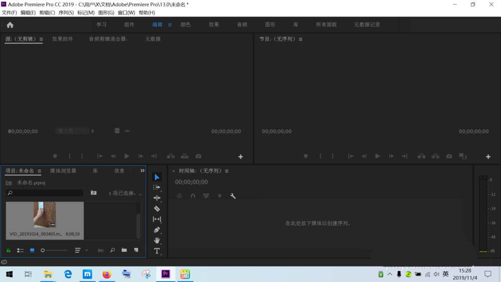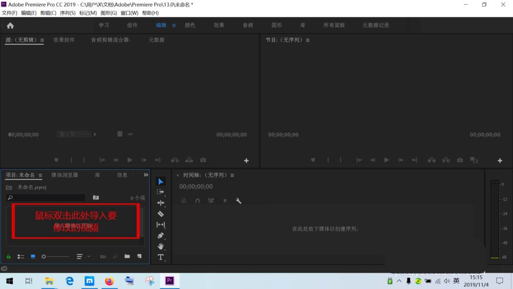 1、在电脑上打开Adobe Premiere Pro CC2019 或者其他版本的软件。新建项目后,鼠标左键双击左下角项目面板的空白处。