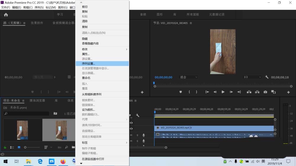 4、在左边的项目面板上观察两个素材,找到右下标只有一个图标的素材,把鼠标放到这个素材上并点击鼠标右键,出现右键菜单栏,选择“序列设置”,左键点击一次并进入菜单栏详细信息。