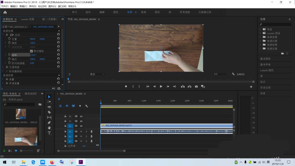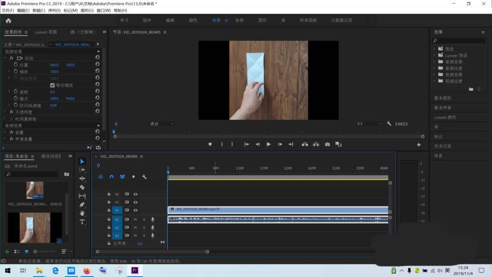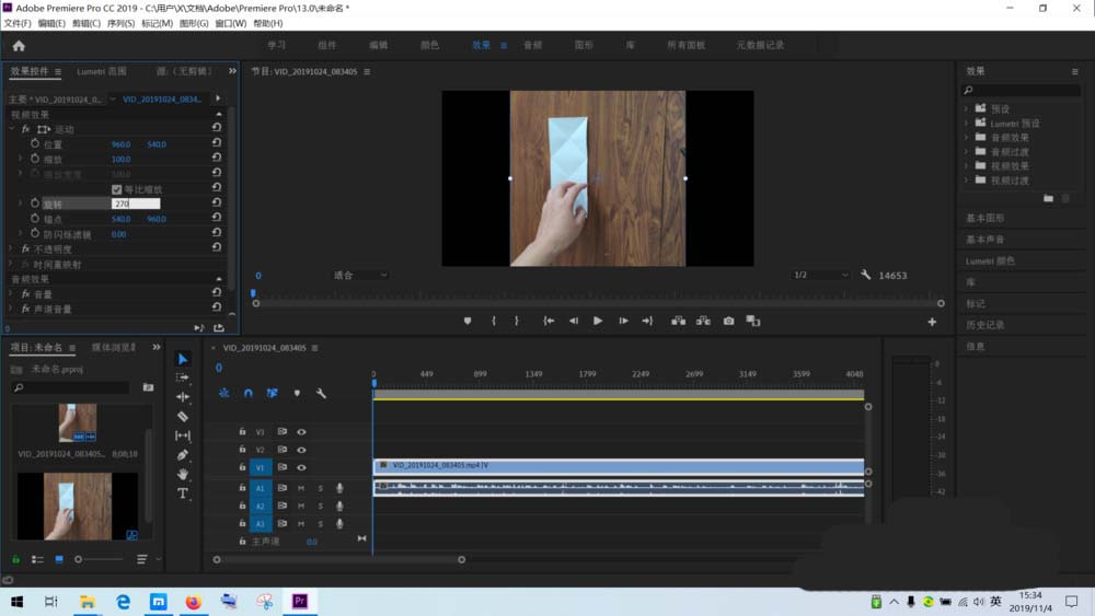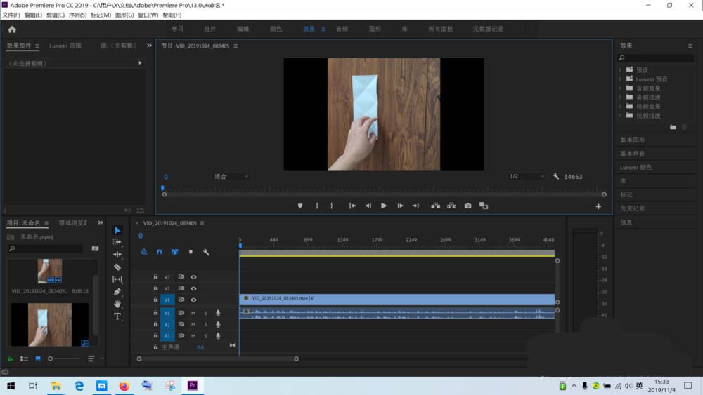 8、点击屏幕上方的”效果菜单“,在左上角出现的效果面板上选择”效果控件“,然后再用鼠标左键点击一下右下角时间轴上的视频素材,左上角“效果控件”就出现了具体的内容了。