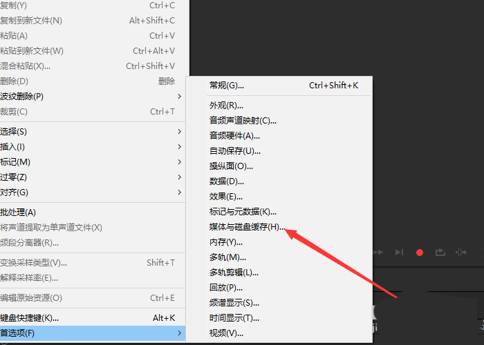 2、然后显示列表选项中选择首选项后再单击”媒体与磁盘缓存“选项。