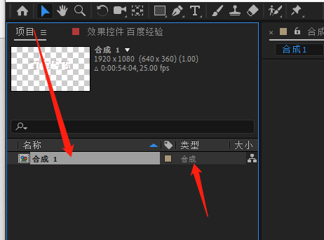 4、这个时候,我们在项目栏里找到合成选项。这里的命名可能是其他的名字,但是类型可以看出是合成。