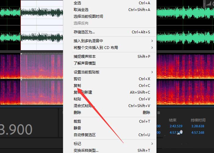 2、先在复制音频文件中先选中要复制的音频片段后单击鼠标右键选择“复制”选项。