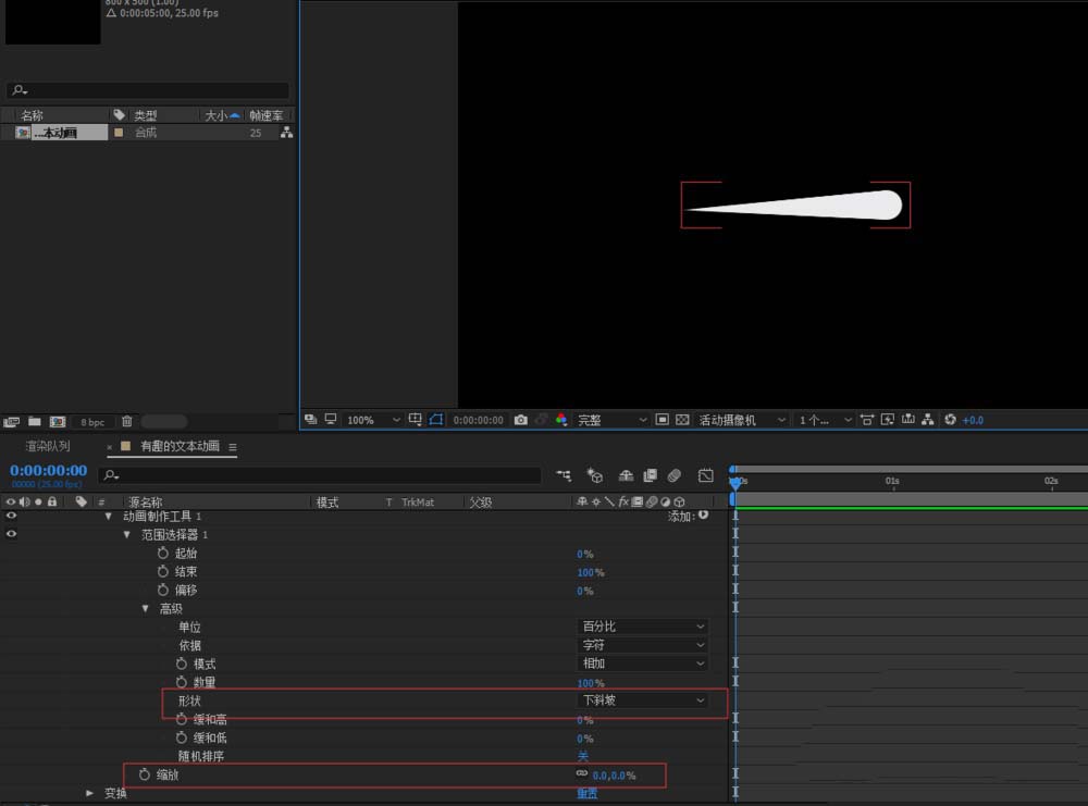 3、通过调整字符间距,形成点成线;然后动画那边添加缩放属性;将缩放数值调整为0;范围选择器里面的高级:把形状选择为下斜坡 这样直线变成了锥形;