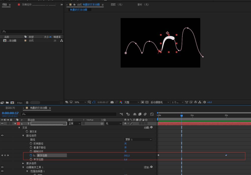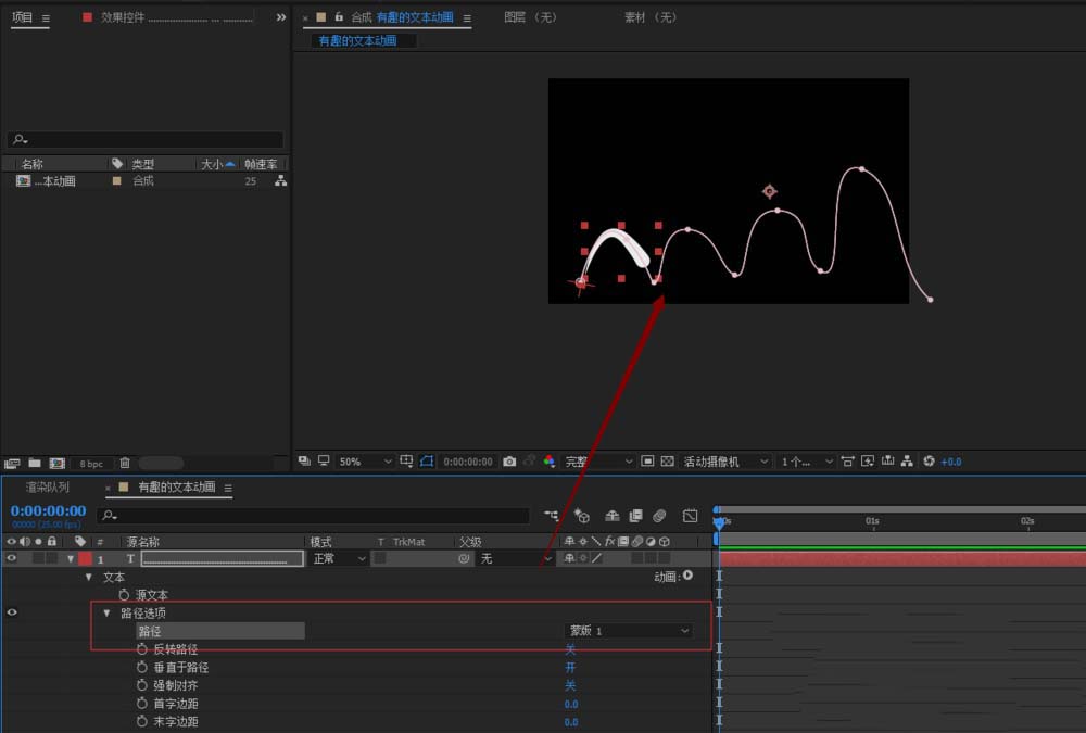 4、选中文本图层 选择钢笔工具绘制好路线,然后调整好的路径曲线,将文本的路径选成我们建立好的蒙版;通过调整首字边距k帧来实现动画;