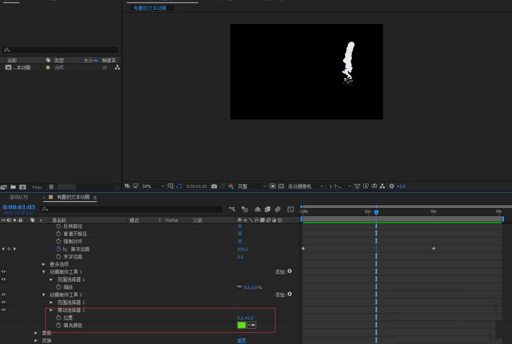 5、接下来我们还可以通过文本的一些参数进行调整细节,比如分组对齐,设置基线偏移等;再动画里添加位置属性,再添加摆动,改变位置参数, 范围选择器为下斜坡,继续添加填充颜色 rgb,填充颜色就可以实现一个颜色拖尾的动画了;