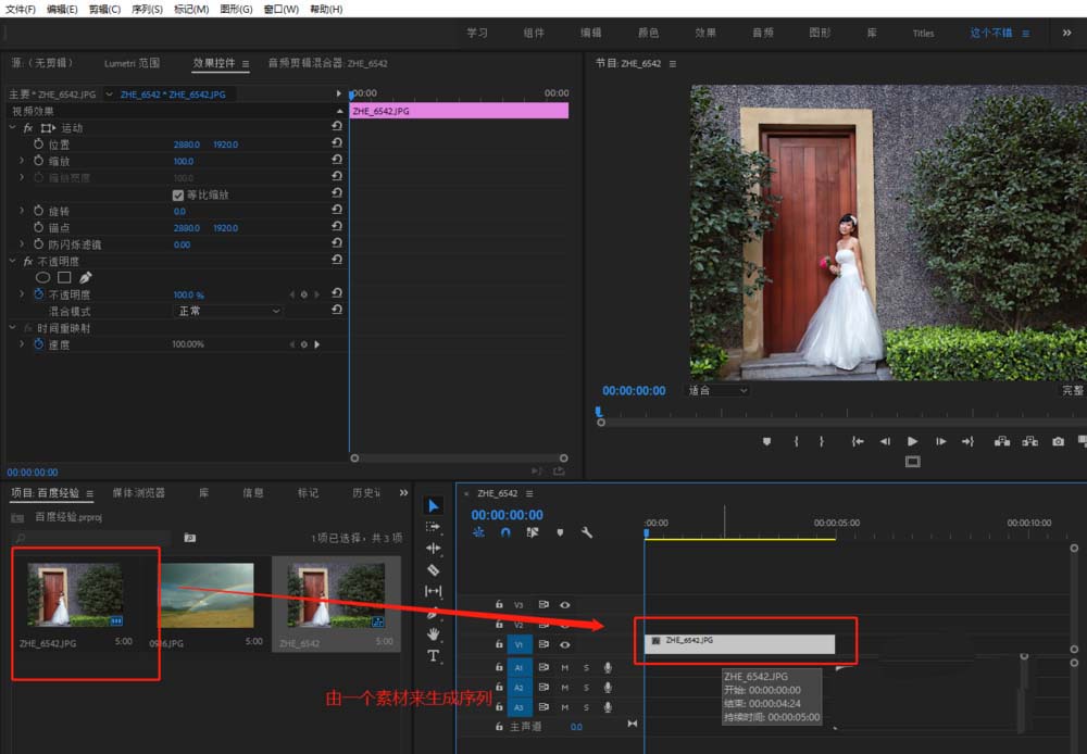 2、选中导入素材中其中一个,由这一个素材来直接生成一个剪辑序列。