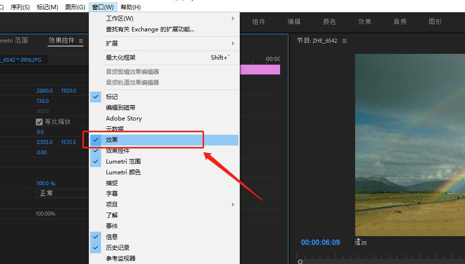 4、找到PR菜单栏中的窗口菜单,单击展开窗口菜单,在展开的窗口菜单中勾选显示“效果”窗口面板。