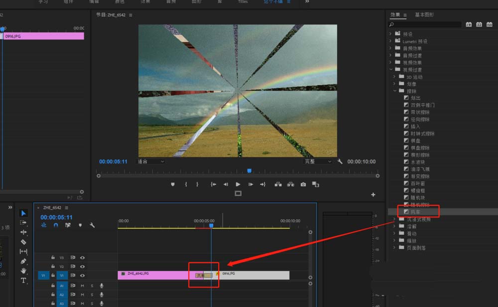 5、然后找到打开的效果窗口,在效果窗口中找到“风车”视频过渡效果,选择风车视频过渡效果将其应用到视频轨道两个媒体素材之间。