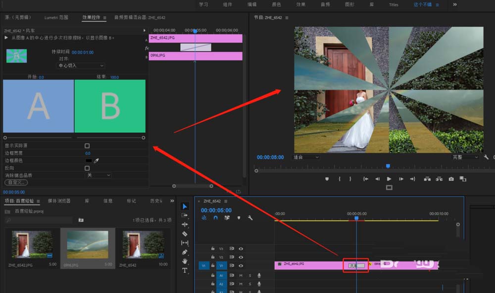 6、添加了风车效果之后,就会出现风车旋转的过渡了,如果你想进一步对风车旋转过渡进行设置,可以打开效果控件进行设置。
