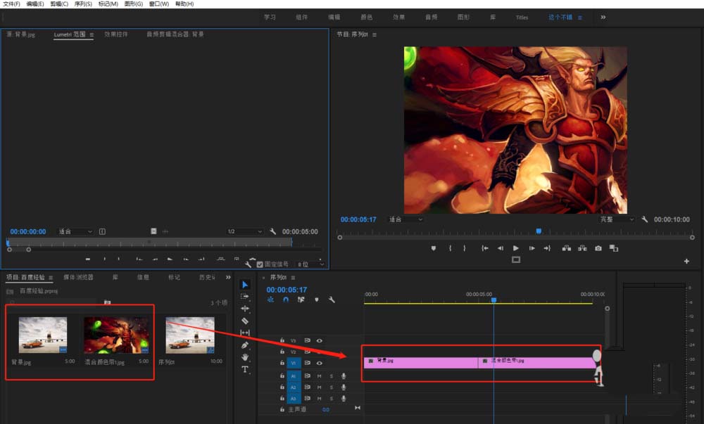 3、创建了序列之后,在依次选中两个导入的媒体素材,将其依次拖到序列时间轴的视频轨道。