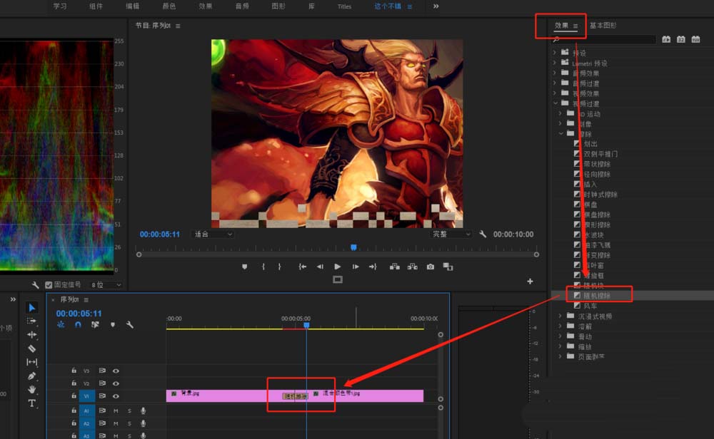 4、在效果窗口中进行随机擦除效果的查找,找到随机擦除效果将其拖动应用到两个媒体素材之间。