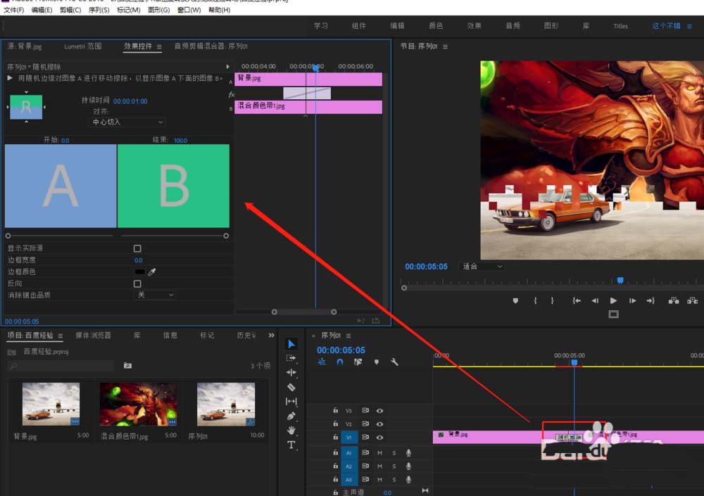 5、单击选中两个媒体素材中间的随机擦除过渡效果,切换打开效果控件窗口,在效果控件中可以对当前的随机擦除效果进行设置。