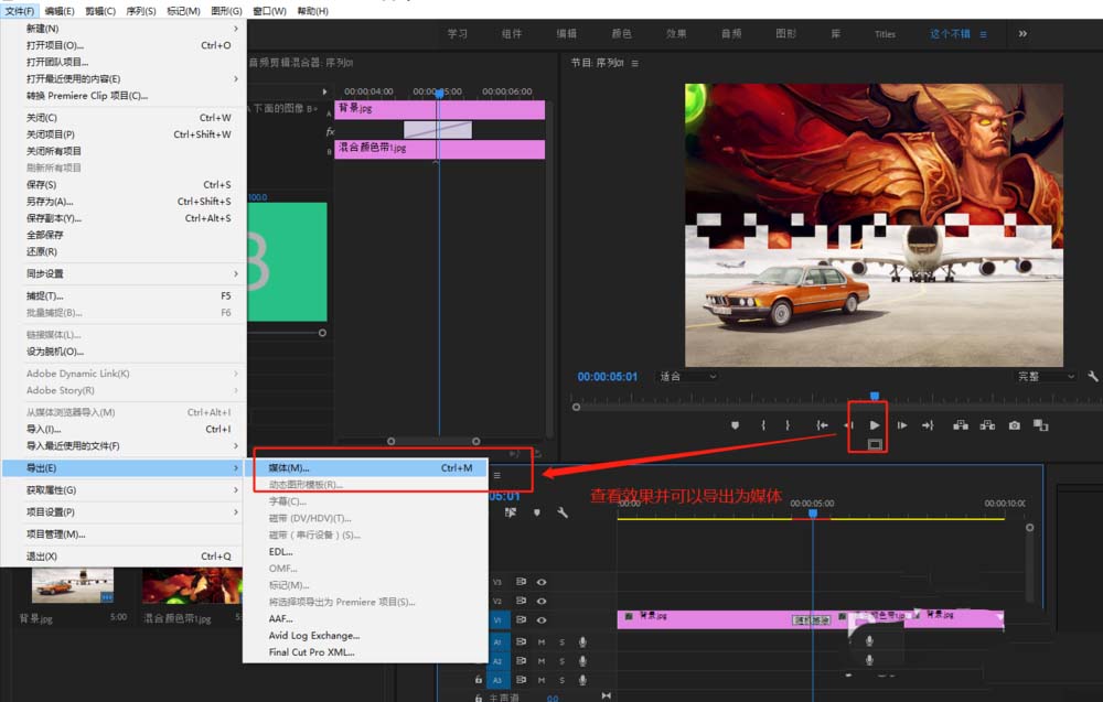 6、播放时间轴查看效果,然后如果你需要导出视频的话,可以将其导出为媒体即可。
