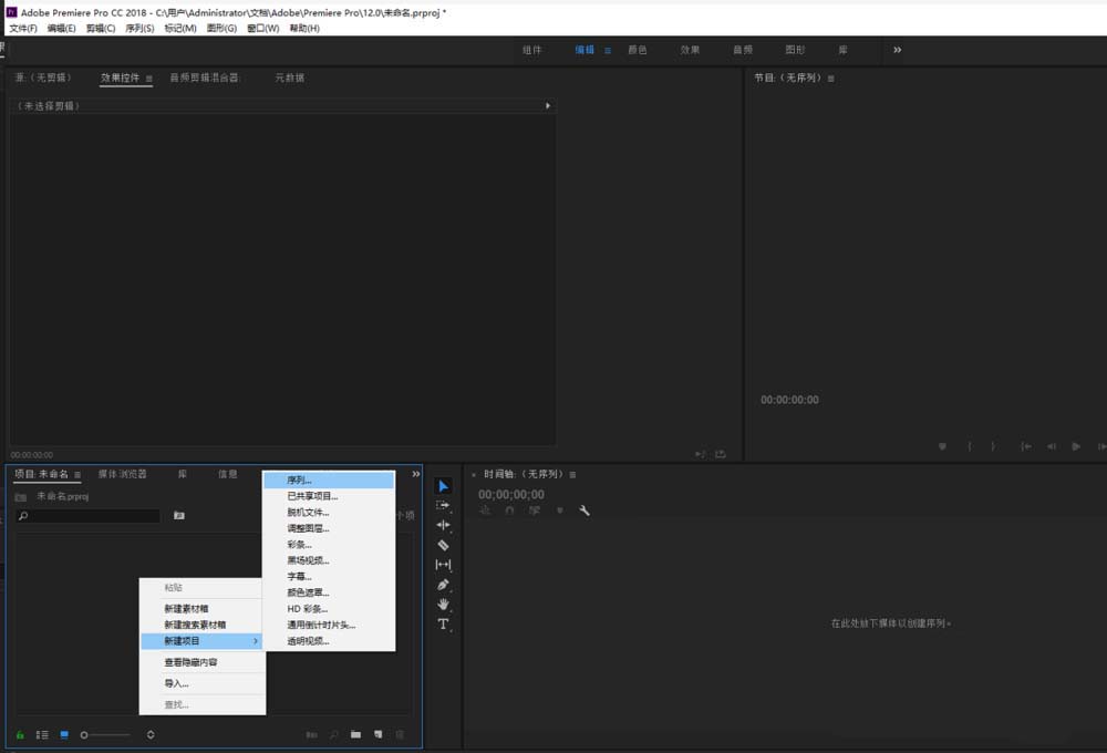 1、打开premiere,选择“文件-新建-序列”或者点击右键“新建-序列”