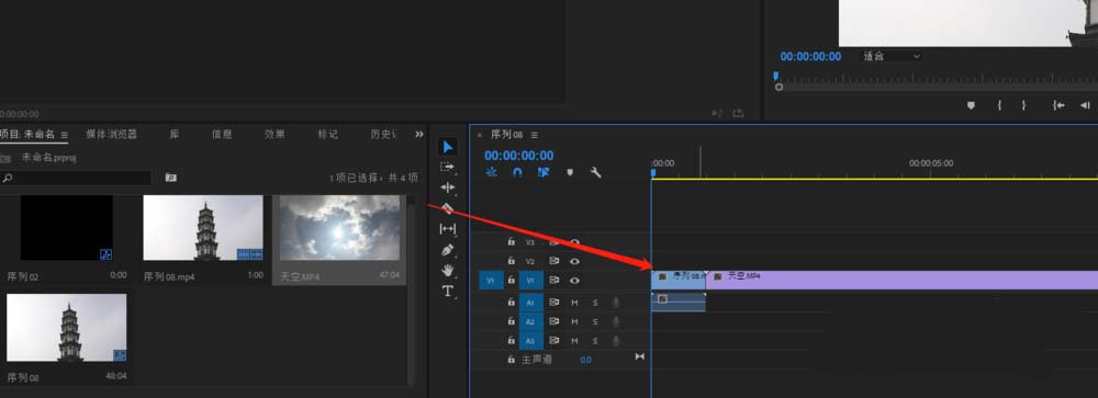 4、将塔素材拖至天空素材之上,拖到时间线观察视频效果即可