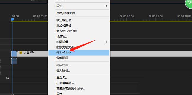 2、在媒体浏览器中导入视频素材,将素材拖着时间轴中,并选中天空素材右键“设为帧大小”