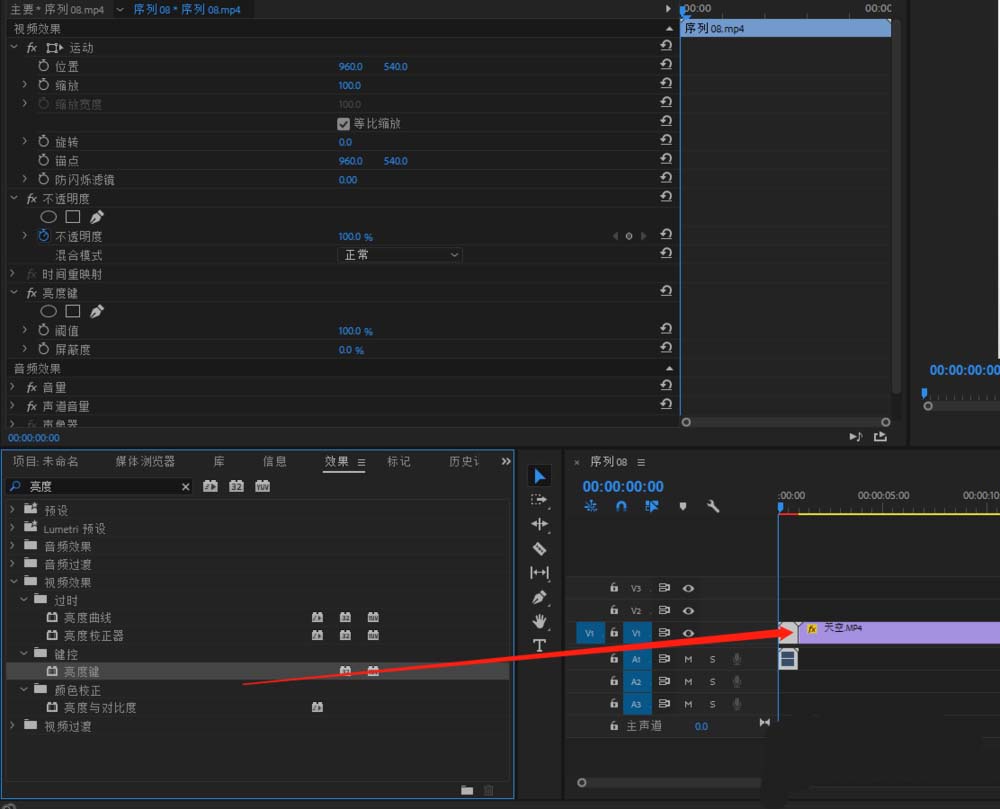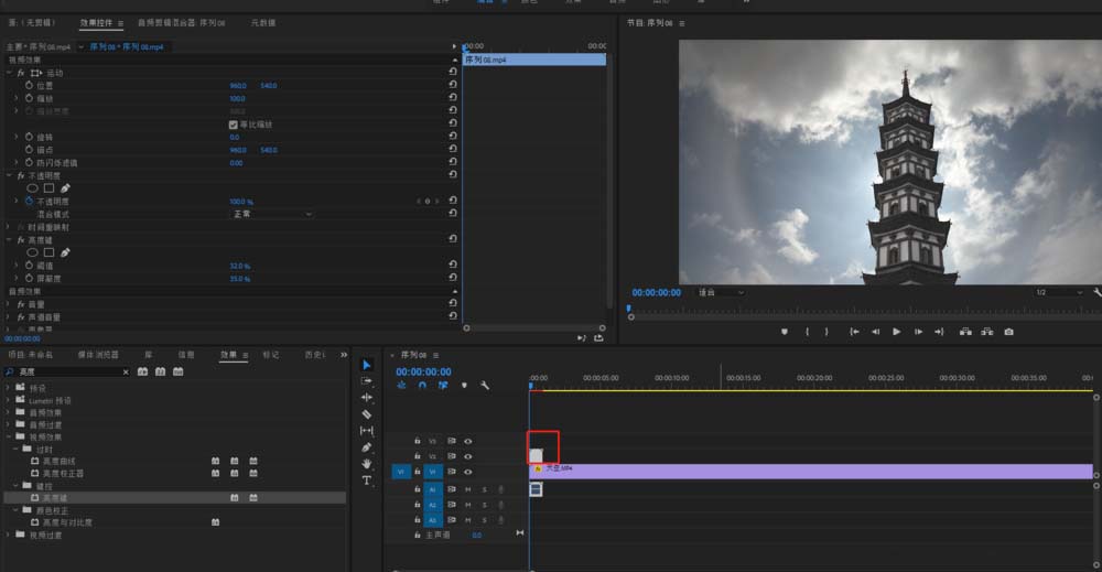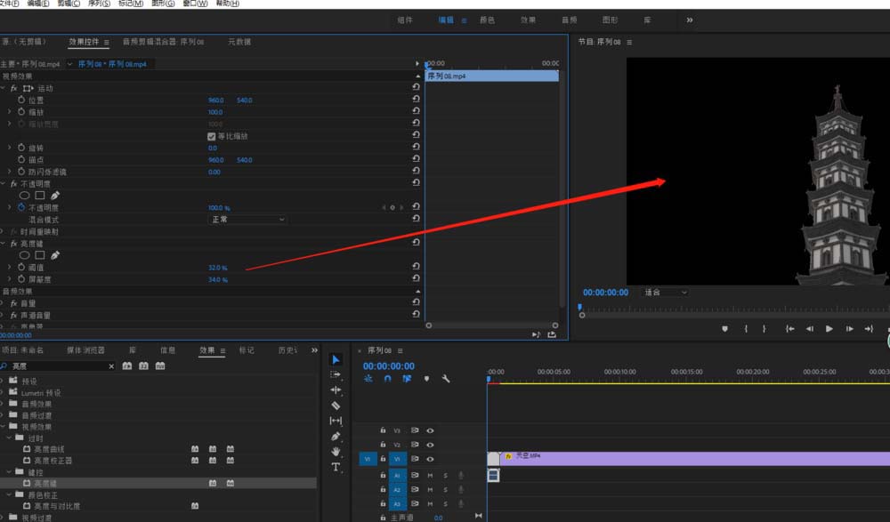 3、在效果搜索框中输入“亮度键”将效果应用到塔素材中,并在效果控件中找到“亮度键”调整“阀值和屏蔽度”调出塔