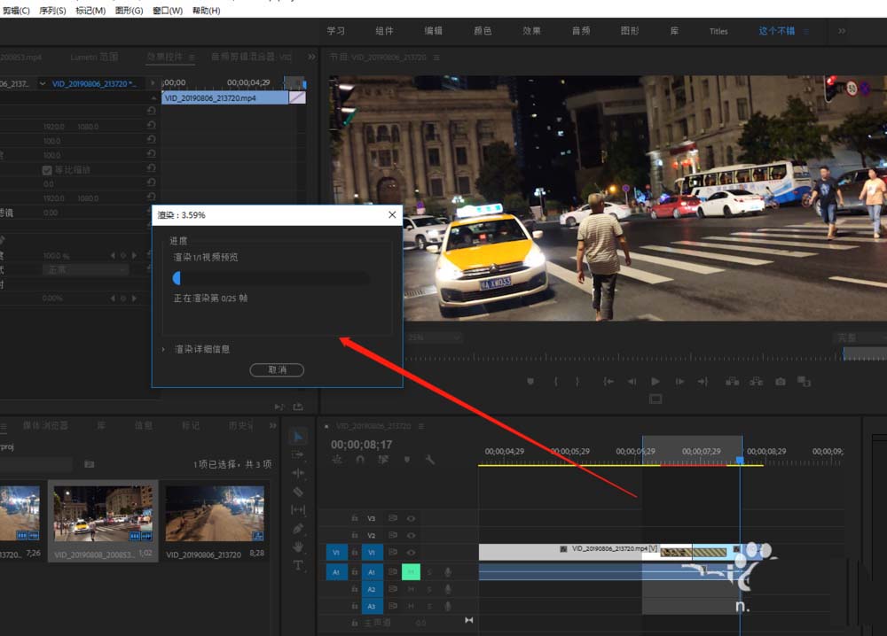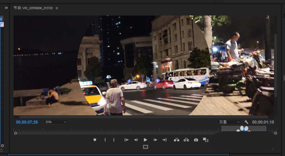6、对设置的圆划像过渡的入点与出点时间段进行渲染处理,渲染之后会自动播放入点与出点,就可以看到一个圆划像的视频过渡效果了。