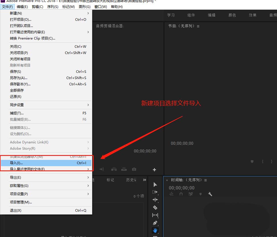1、先来新建一个PR项目,然后执行文件菜单栏中导入命令,导入不同的两个或多个视频素材。