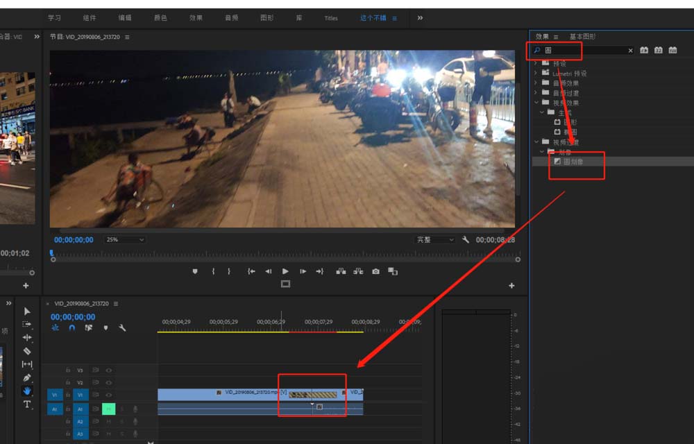 3、搜索PR视频过渡效果,找到PR中的“圆划像”视频过渡转场,将这个圆划像效果应用到两个视频之间。