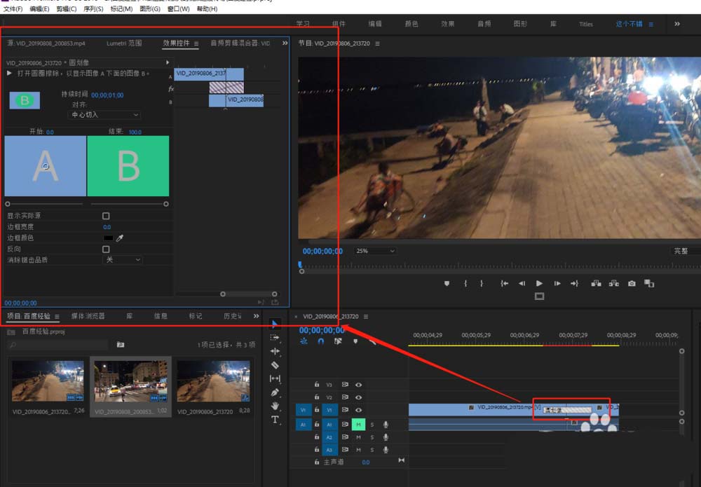 2、根据导入的视频素材来创建序列,并将两个视频在序列的同一个时间轴首尾相接摆好位置。