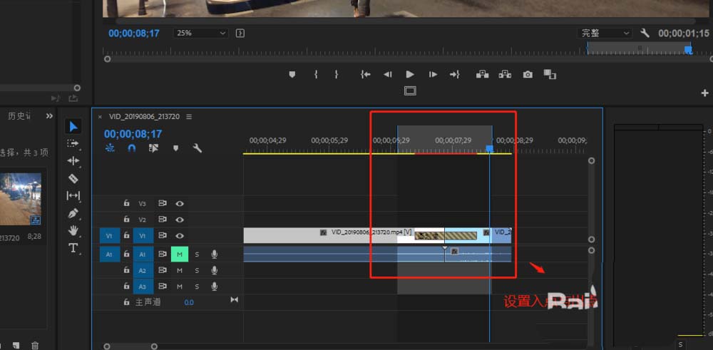 5、在过渡之前的位置按I键设置入点,然后在过渡后的位置按O键设置出点。