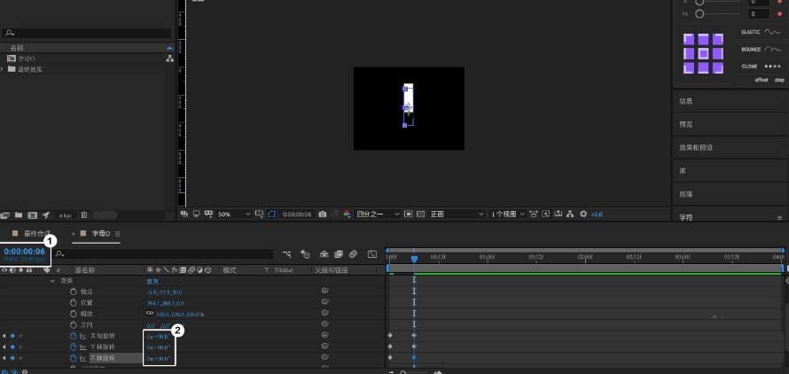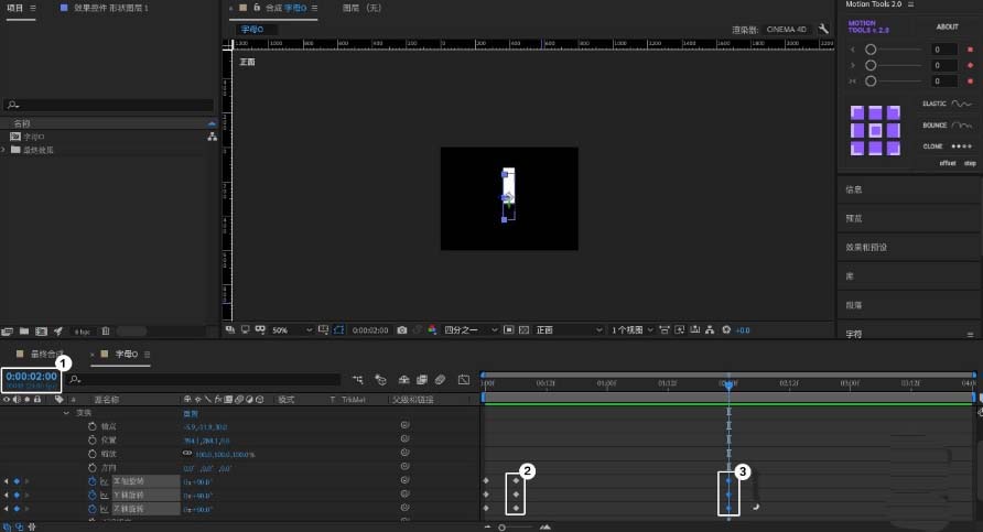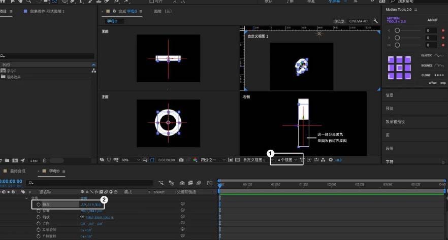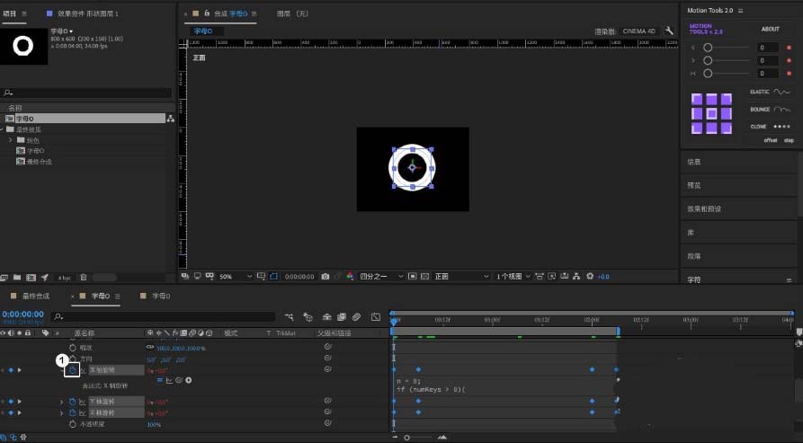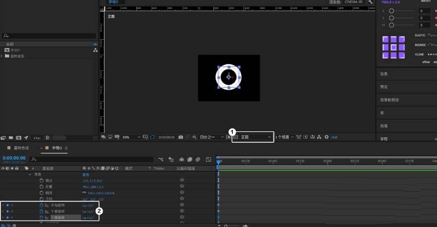 9、将视图改为「正面视图」展开O图形的「变换」,并在X、Y、Z打上关键帧