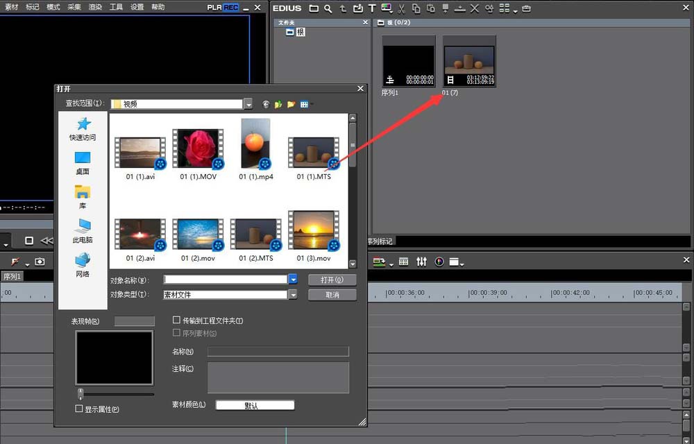 1、首先就是新建EDIUS工程文件之后,进行视频的导入,一定要导入到素材库中,方便后期编辑。