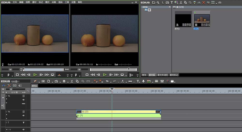 2、然后将这段视频素材导入到EDIUS时间线上的视频轨道上,开启双屏幕预览编辑模式。