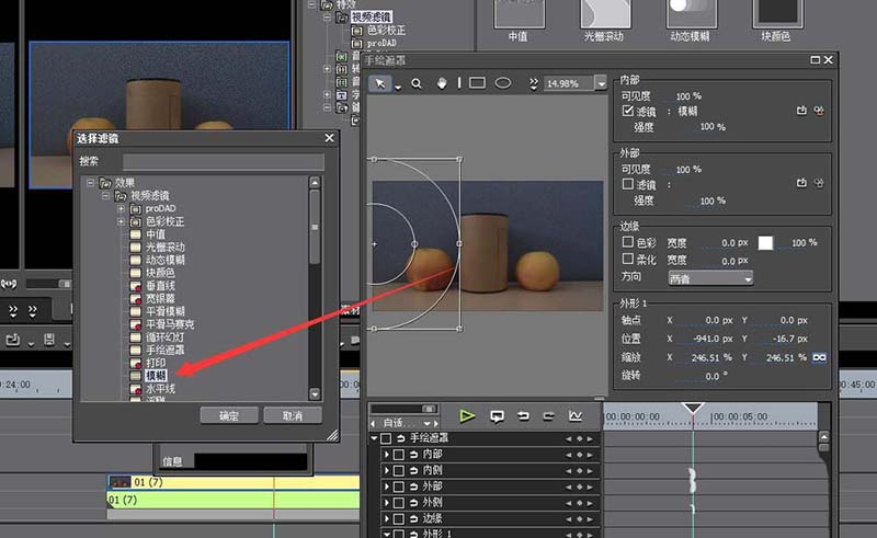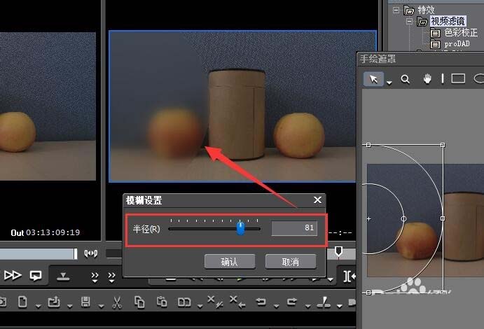 5、为圈划区域的内部进行“模糊”特效的添加,添加完成之后,重新设置模糊的半径(80左右的数值)以及柔化的宽度。