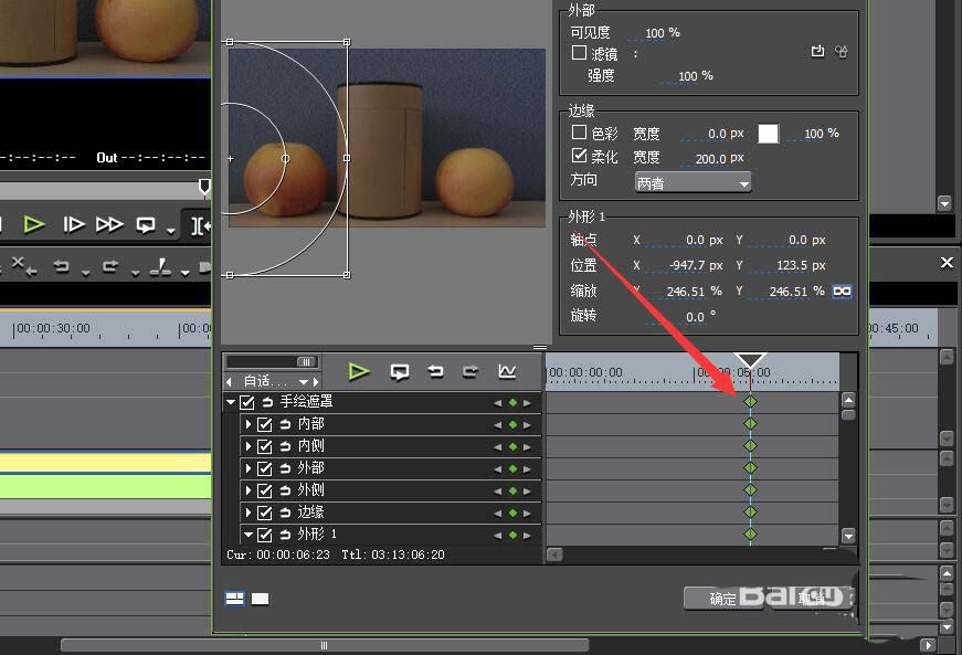 6、然后在“手绘遮罩”下面的时间线轨道上,添加第一组关键点。
