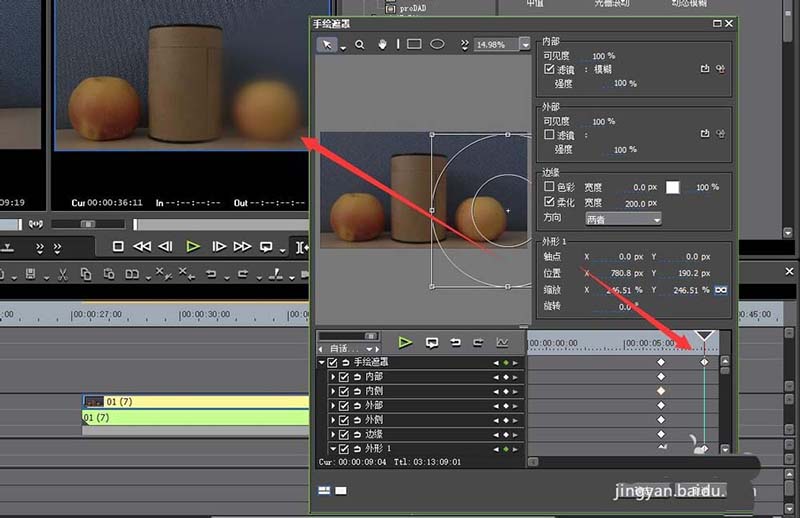 7、继续添加第二组关键点,这个第二组关键点要注意将模糊的圈划位置进行移动,移动到想要模糊景深的位置。这样就完成了视频的景深变化效果制作。