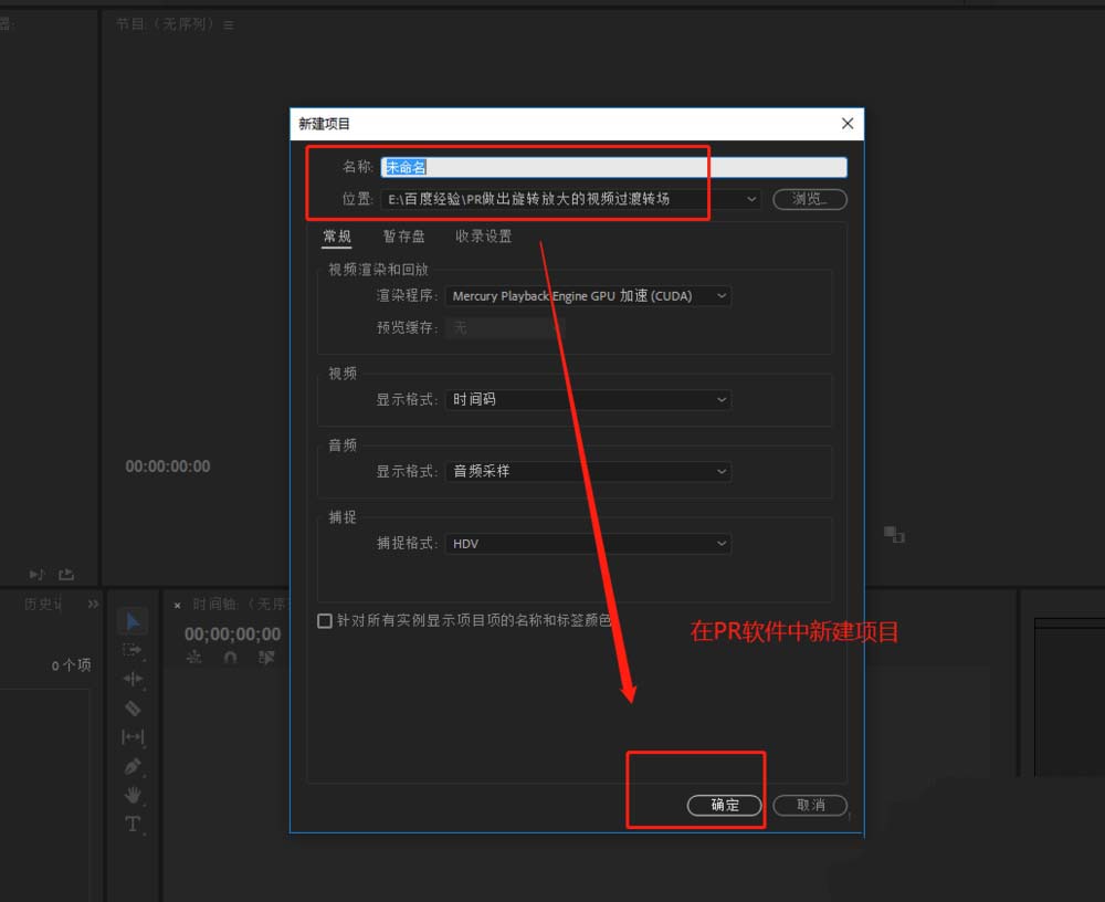 1、启动打开Premiere软件,选择新建一个项目,设置这个项目的名称与保存位置,点击确定。