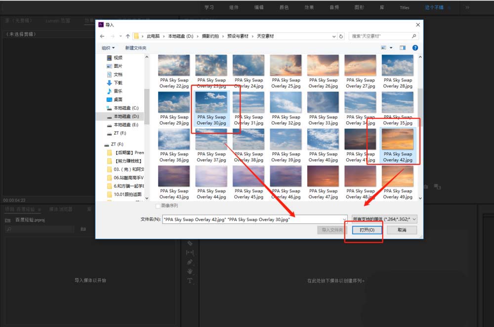 2、按Ctrl+I这个快捷键执行导入,在弹出的导入对话窗口中选择两个媒体素材导入到PR。