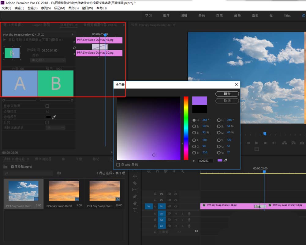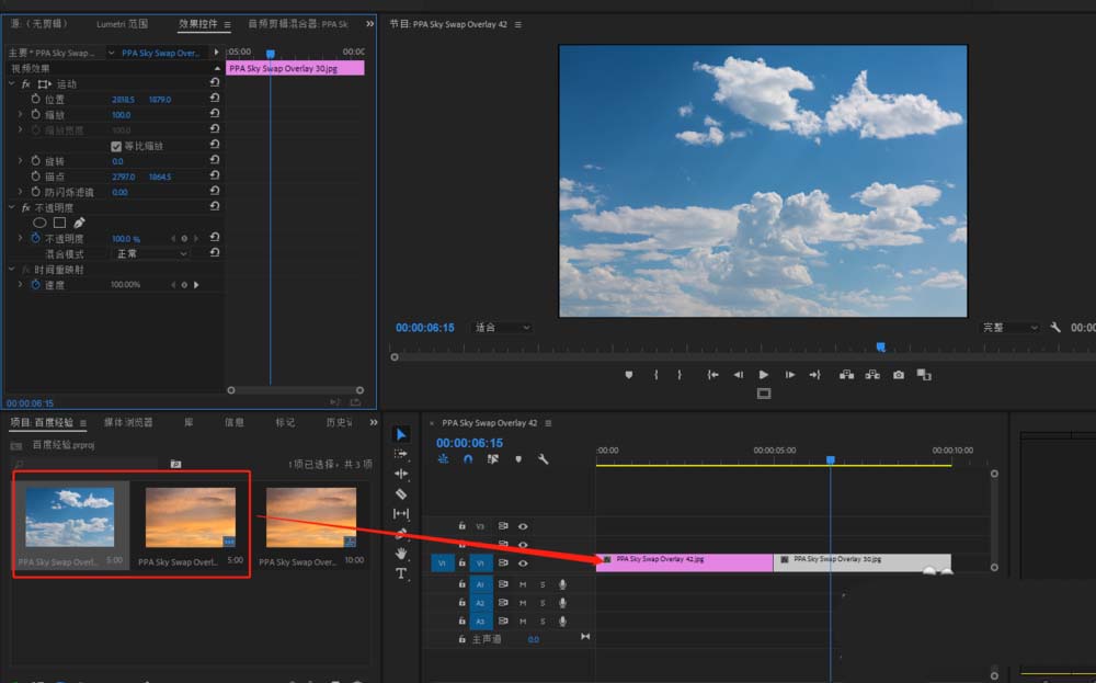3、创建一个序列,或者直接由导入的媒体素材来生成一个序列,并将导入的媒体素材拖到序列的视频轨。
