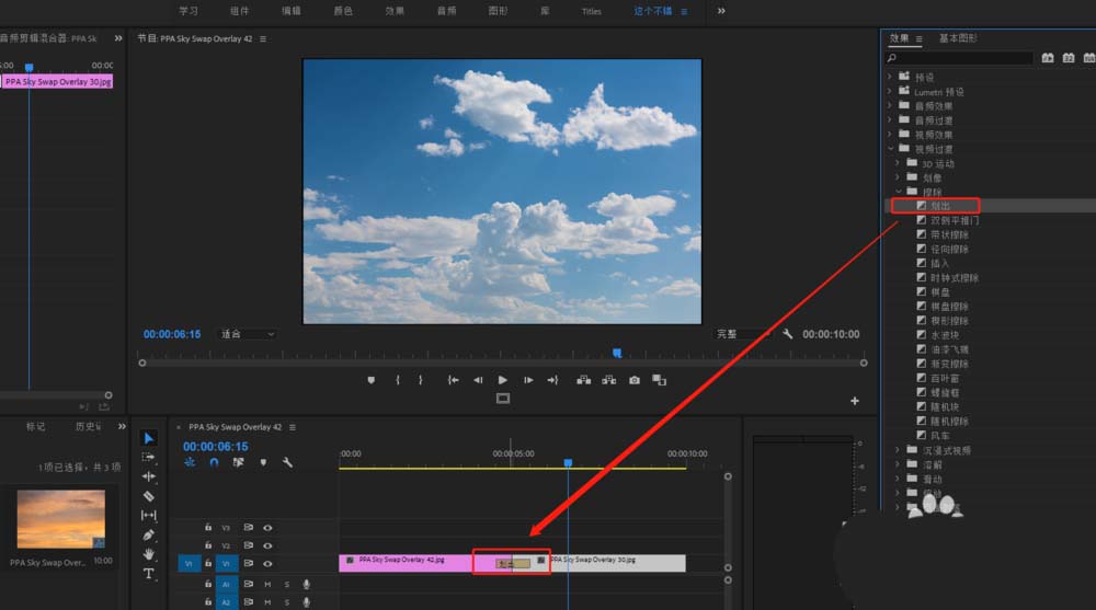 4、在PR视频过渡中找到划出这个过渡效果,按住鼠标左键不松将其拖到两个媒体素材的中间。