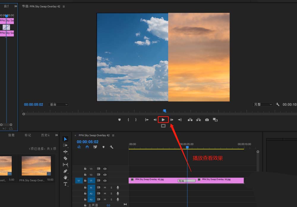 6、在点击预览窗口下的播放按钮,播放视频轨的媒体素材,当播放到过渡位置时,就能看到划出显示的过渡效果。