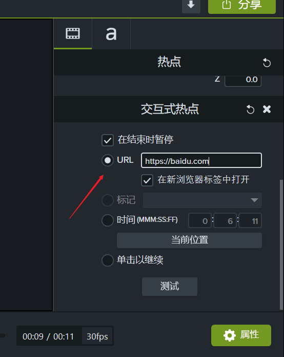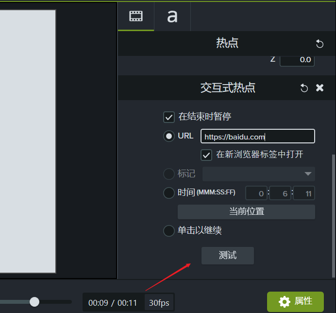 4、然后点击一下交互式热点面板属性下面的测试小按钮