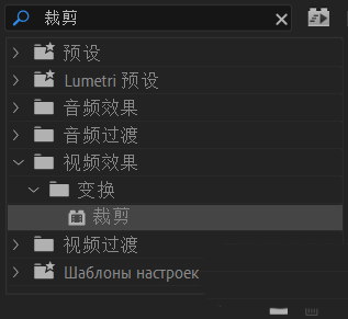 2、接着,我们在效果面板中输入裁剪进行搜索,找到效果,拖拽应用到视频之上